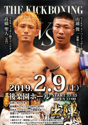 NKB 2019 出陣シリーズ vol.1(2月9日(土)後楽園ホール)の対戦カードが発表された。12月16日のINNOVATION岡山ジム主催興行での59kg賞金トーナメントで1日3試合戦い、惜しくも準優勝に終わった髙橋聖人が、2か月足らずの間隔でホームリングに帰還し、メインイベントに登場。NJKFスーパーフェザー級3位の山浦俊一を迎え撃つ。他にも他団体やフリーのジムとの交流戦が多数並び、角谷祐介(NEXT LEVEL渋谷) vs. 藤野伸哉(RIKIX)というNKB外の選手同士の試合も組まれている。