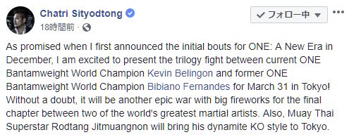 ONE : A NEW ERA -新時代-(3月31日(日) 両国国技館)にバンタム級チャンピオンシップ・ケビン・ベリンゴン(フィリピン/王者)vs. ビビアーノ・フェルナンデス(ブラジル/挑戦者、元王者)が追加された。また、ロッタン・ジットムアンノン(タイ)の参戦もONEのチャトリ・シットヨートン会長兼CEOの27日のフェイスブックで発表されている。