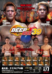 DEEP☆KICK 39(4月7日(日)テクスピア大阪)の全カードと試合順が発表された。メインイベントはDEEP☆KICK-60kg王者の谷岡祐樹(パラエストラ加古川)が挑戦者決定トーナメントを勝ち上がった中村寛(BKジム/1位)を迎え撃つ。セミファイナルは、新設されたDEEPK☆ICK-57.5kg王座決定トーナメントの準決勝が2試合行われる。またオープニングイファイトは、アマチュアキックボクシングNEXT☆LEVELの関西王者と中四国王者が統一戦を行う。チケットは、指定席がすべて完売で残りは立ち見のみとなっている。