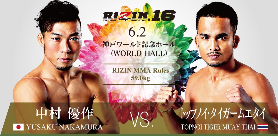 RIZIN.16(6月2日(日)神戸ワールド記念ホール)に6試合が追加され、全14試合が決定した。大阪出身の中村優作が昨年9月のマネル・ケイプ戦で敗れて以来9カ月ぶりにRIZINに参戦し、同じく9月大会で朝倉海に敗れて以来の参戦となるトップノイ・タイガームエタイとの日本拳法vsムエタイのストライカー対決に臨む。なお、中村の相手は海で内定していたが、5月8日に予定されていたカード発表記者会見の前日の7日、海が練習中に負傷し、眼窩底骨折・全治2ヶ月と診断されたため実現せず、トップノーイが代役となった。
