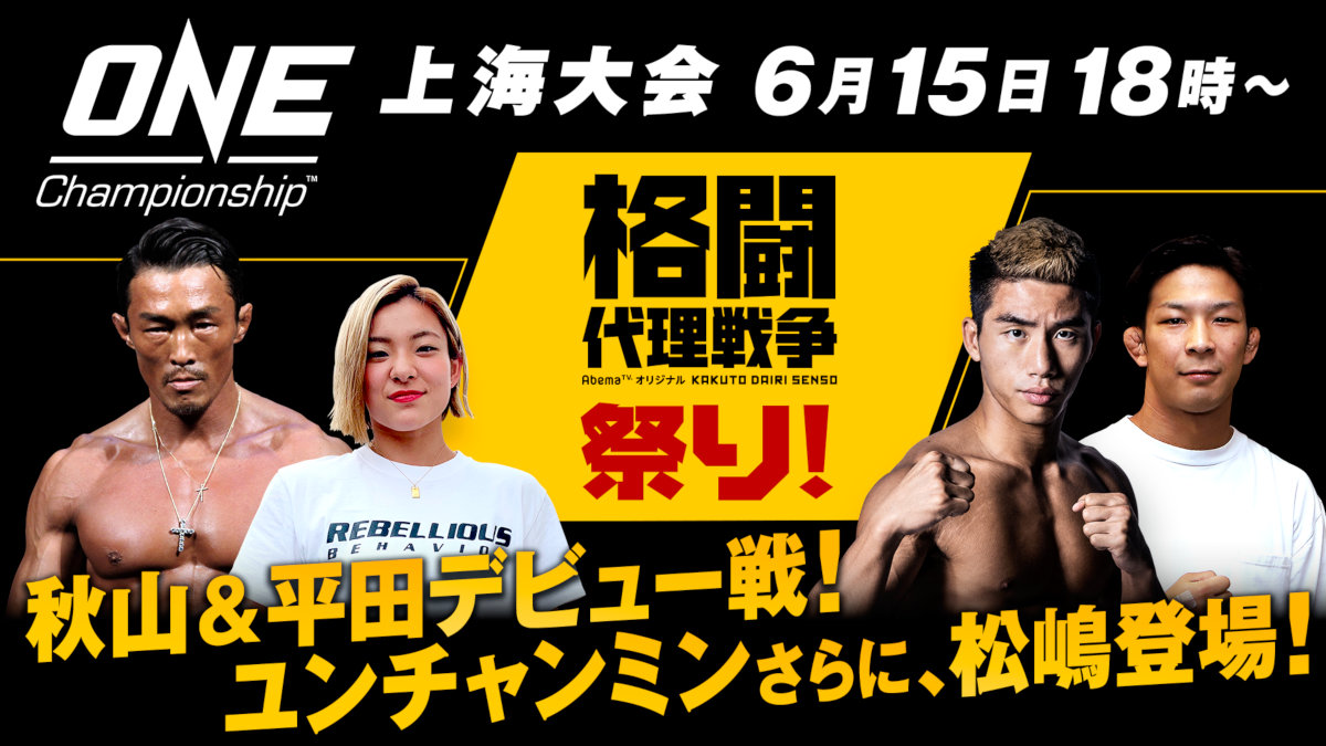 ONE Championship上海大会をAbemaTVで生中継!! AbemaTV視聴者には「格闘代理戦争」でもおなじみの「Sexyama」こと秋山成勲、そして卒業生の平田樹がそろってONEデビュー戦!さらに秋山の愛弟子ユン・チャンミン、さらに鮮烈なONEデビューから怪我で戦線を離れていた 松嶋こよみも登場!UFC時代には3度のファイト・オブ・ザ・ナイトを獲得した激闘王でもある秋山。齢43にして挑む新しいフィールドでデビューを飾ることはできるのか!?ONEデビュー戦の平田樹は、「格闘代理戦争3rdシーズン」 出身。プロデビュー戦はいきなりのグローバルステージ、その実力が試される。