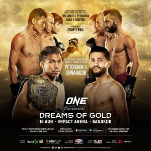 ONE Championship「ONE: DREAMS OF GOLD」(8月16日(金)タイ・バンコク・インパクトアリーナ)の対戦カードが発表された。タイで開催のため、ムエタイルール、肘無しのキックボクシングルールの試合が多く、メインではペッダムが5月のバンコク大会で獲得したキックボクシング フライ級(61.2kg)の防衛戦を行い、ジョルジオ・ペトロシアンが勝ち残ったキックボクシング フェザー級(70.3kg)ワールドGP準決勝2試合も今回行われる。大会の模様はAbemaTVで生中継される。