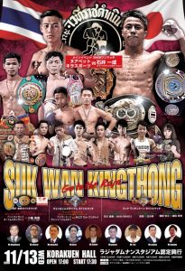 SUK WAN KINGTHONG(スック・ワンキントーン)Go to Raja(11月13日(水) 後楽園ホール)でスック・ワンキントーン・スーパーフライ級王座の防衛戦を予定していた石川直樹(治政館ジム)が欠場する。10月4日のKNOCK OUTでの仲山大雅戦でTKO負けし負傷したため。石川に挑戦予定だったMASA BRAVELY(BRAVELY GYM)はラチャシー・ノーナクシン(タイ/ノーナクシンムエタイジム東京)と王座決定戦を行う。ラチャシーは戦績60戦40勝18敗2分で、日本ではTOMONORI、藤原あらし、朝陽P.K.センチャイムエタイジムにKO負けしている。