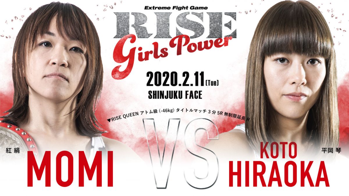 来る2月11日(火/祝)新宿FACEで開催される『RISE GIRLS POWER 2』の決定カードをお知らせします。RISE QUEENアトム級王者の紅絹が今大会で初防衛戦を迎え、挑戦者はTRY HARD GYMの平岡琴に決定。(記事提供:RISEクリエーション)