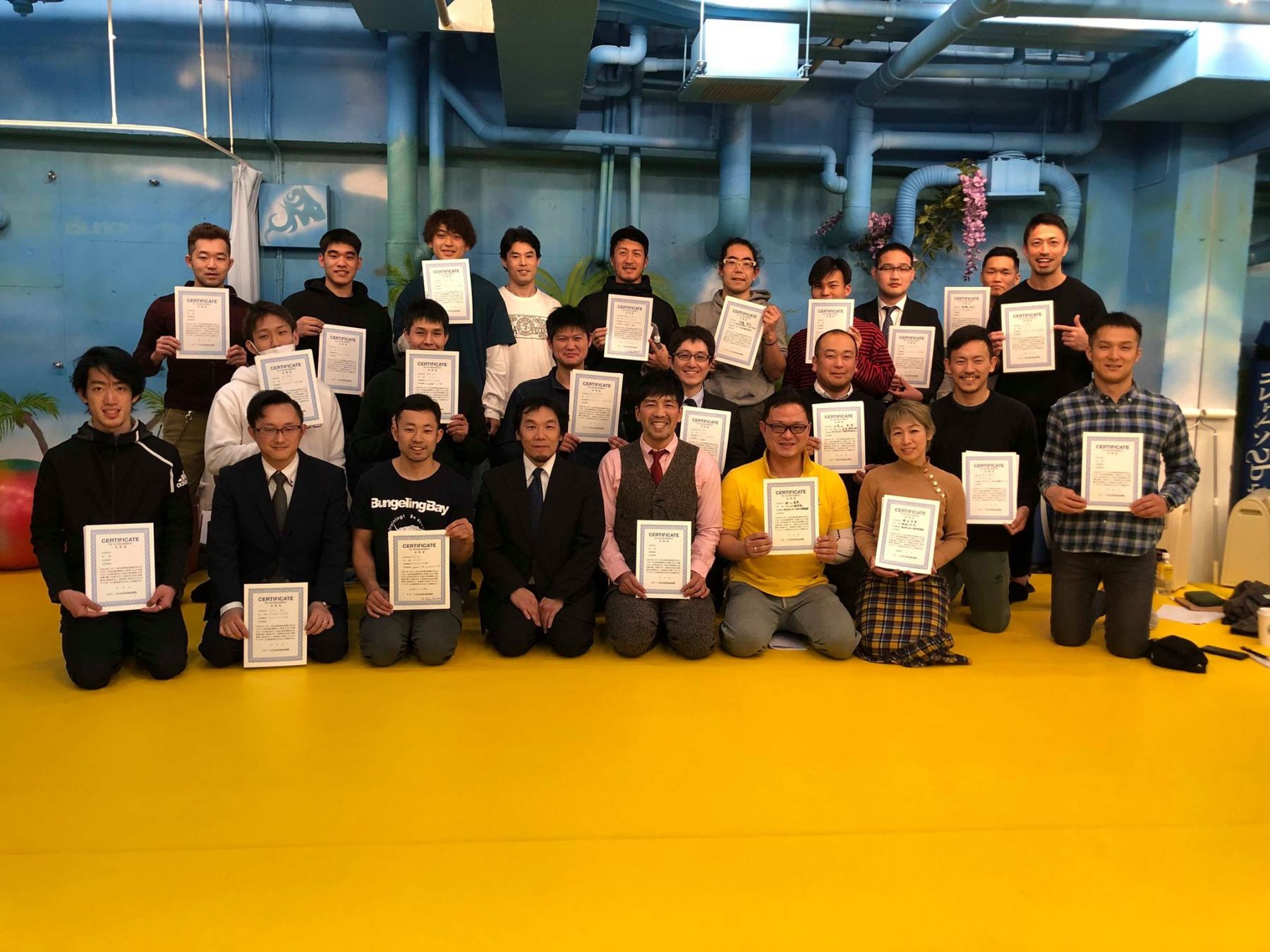「スポーツ安全指導推進機構」による講習会は、安全性に意識の高い指導者を「見える化」する試み。頭部外傷、心臓震盪、内臓損傷、内科的リスク、パンチドランカーなど、「命に関わるテーマ」について、指導者層に講義が行われた。講義後、即日テストが行われ、バンゲリングベイの新田明臣代表ら25名が合格し、同機構が「安全に意識の高い指導者」として認める「合格証」が授与された。