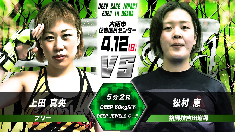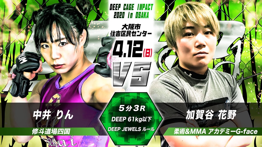 DEEP CAGE IMPACT 2020 in OSAKA(4月12日(日)大阪・住吉区民センター 大ホール)にDEEP JEWELS 2試合、61kg契約(フェザー級相当)中井りん(修斗道場四国)vs. 加賀谷花野(柔術&MMAアカデミーG-face)、80kg契約・上田真央(フリー) vs. 松村恵(格闘技吉田道場)が追加された。