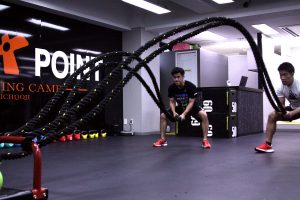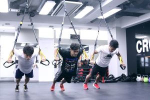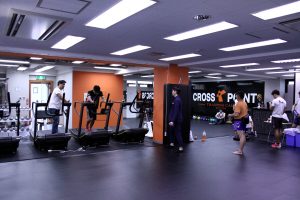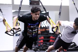 スキルミルは自動で動くランニングマシンとは異なり自走式で、湾曲した床面が特徴。負荷レベルを調整することで、スタミナや下半身などを効果的に強化できる。クロスポイントの公式サイトによると、武蔵野地区では初導入とのことで、既に一般会員の体験会でも好評だという。TRXでは関節の可動域を広げてのトレーニングが可能になり、筋力と共にバランス感覚も磨かれる。従来からあったマットスペースも含めて2階スペースが全面リニューアルし、リングやサンドバッグのある1階と合わせ、選手たちにとっても練習環境がより充実する。