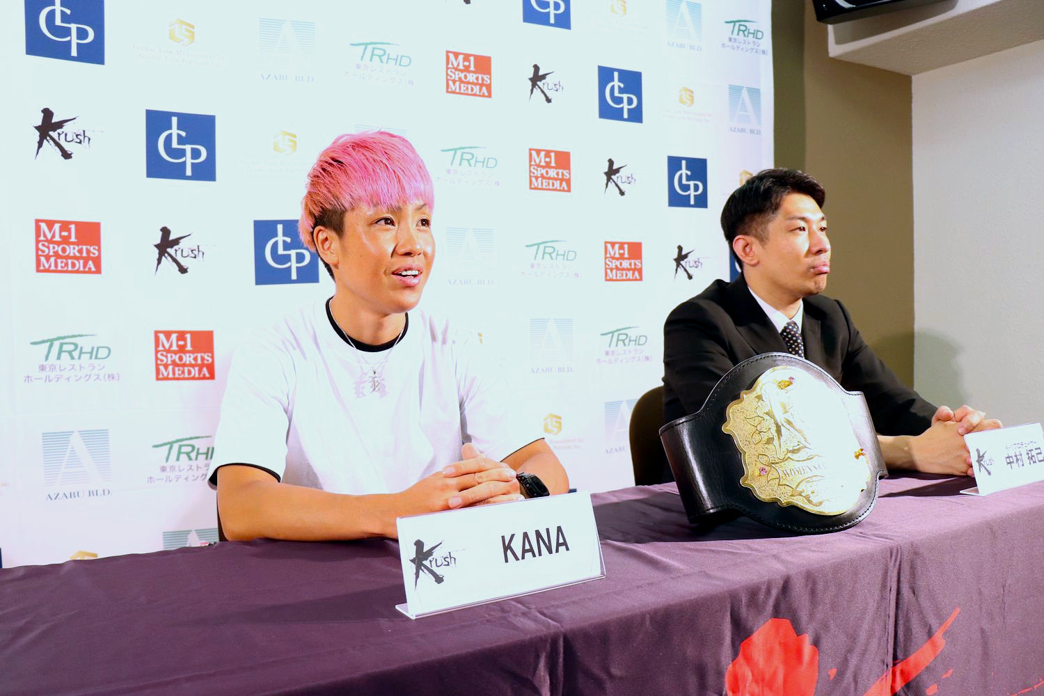 会見でKANAは「自分はK-1アマチュアからKrushでデビューさせてもらって、Krushでは12戦11勝1敗という成績でした。一度チャンピオンになって、メロニー選手に負けてしまって、メロニー選手に勝ってまたベルトを巻くことが出来て、このKrushという舞台は、次につながる舞台でした。今自分がK-1に出ているのもKrushのおかげです。自分にとってはKrushがスタートで、Krushで試合をするのは一段落かなと思います。次はK-1をさらに大きくするために、K-1の舞台で次につなげる試合をするためにKrushのベルトを返上することを決めました」と挨拶。