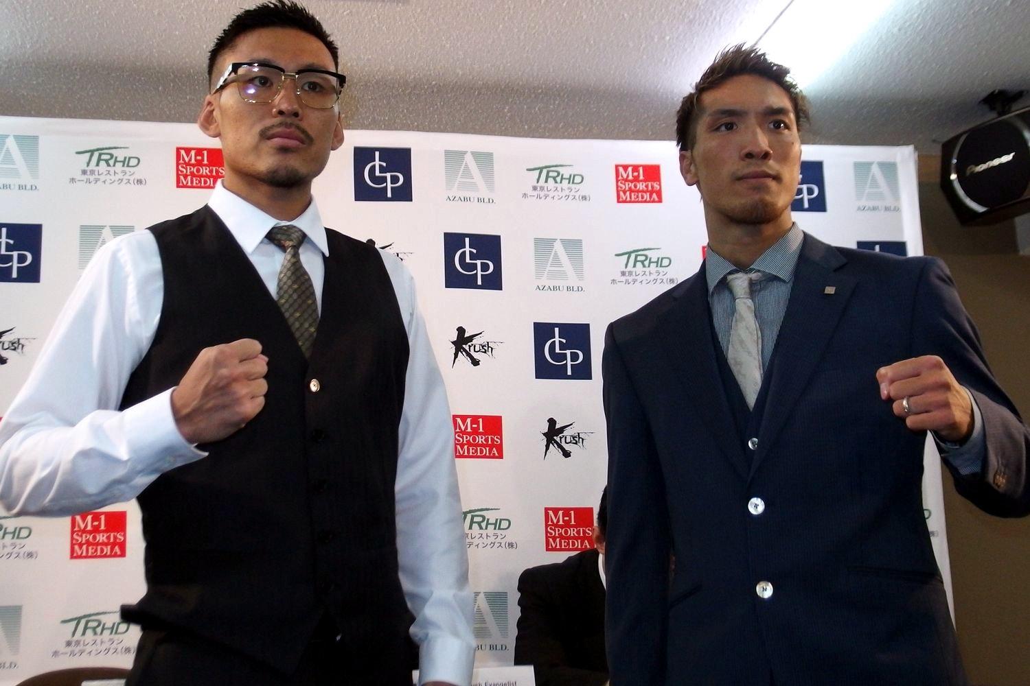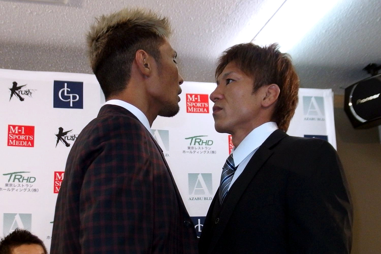 明日の第7試合でKrushライト級で闘う大沢文也と蓮實光は、会見の中で舌戦を展開。ツーショット撮影時にいきなりフェイス・トゥ・フェイスで睨み合いとなるなど、かなり前のめりで明日の試合に挑む。