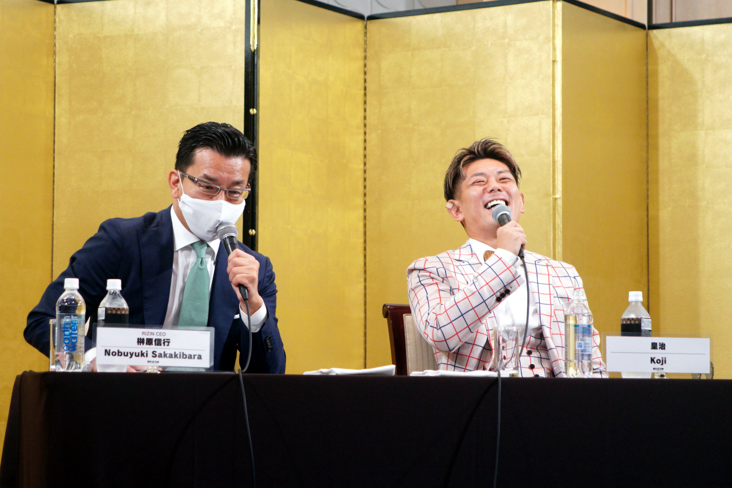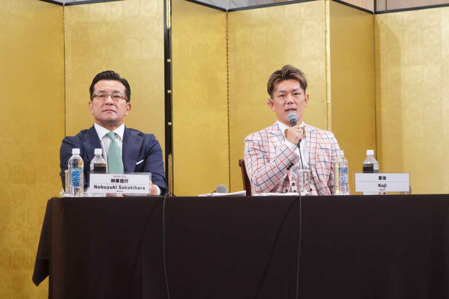 皇治のRIZIN参戦の経緯について、榊原氏は囲み取材で「僕らは選手を抜いた、抜かれたということはしたくない。5月後半に皇治選手の弁護士を通じ、K-1さんとの契約はクリアできていると聞いていました。交渉の事前に、K-1サイドにも『こういう話が来ていますけど進めていいですか』と確認しましたし、今日発表をしていいかもK-1さんに確認し『全く問題無いです』『皇治選手の活躍を期待しています』という一言ももらいました」と説明し、K-1サイドへの配慮を強調。会見中に皇治の口から武尊と天心の話が出た後も「武尊天心について軽々に僕の立場から言うと(対戦実現を)遠ざけることになる」とフォローも忘れなかった。