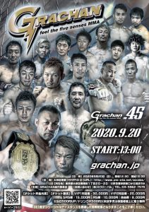 GRACHAN 45(9月20日(日)東京都大田区産業プラザPIO)の主要カードが発表された。3月1日以来約7カ月ぶりの開催で、新型コロナウイルスの感染予防のため、キャパの3分の1の400席前後での開催となる。昨年12月のGRACHAN×GLADIATORでロクク・ダリに2R腕十字で勝利し、GRANDウェルター級王座を獲得した桜井隆多が、パンクラスとGRACHANで活躍してきた長岡弘樹を相手にGRAND王座の初防衛戦を行う。長岡は同じ大会で元UFCファイターのウィル・チョープとの王座挑戦者決定戦で判定勝ちしていた。桜井は9月18日で49歳になり、長岡は3月4日で40歳に。2人合計89歳とは思えない激しいファイトが期待できる。以下は決定カードと主催者から届いた見所紹介。