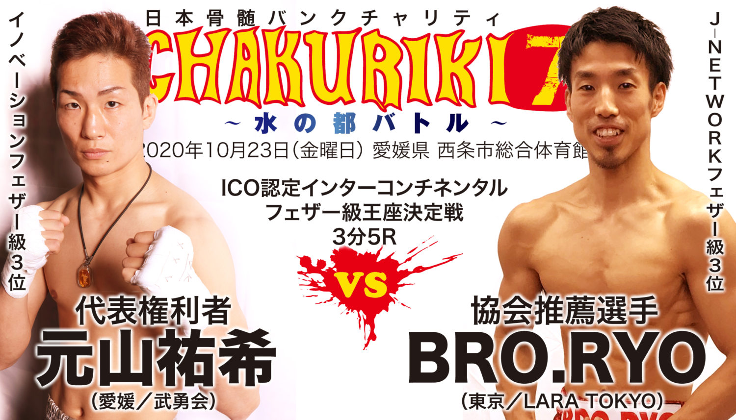 CHAKURIKI 7(10月23日(金)愛媛・西条市総合体育館)で行われるICO(国際チャクリキ協会)認定インターコンチネンタル・フェザー級(57kg)王者決定戦の元山祐希(武勇会/INNOVATIONフェザー級3位)の対戦相手が、ロベルト・オリビア(イタリア)からBRO.RYO(LARA TOKYO/J-NETWORKフェザー級3位)に変更となった。オリビアの出場は6月23日に発表されたが、引き続き新型コロナウイルスの影響で海外からの渡航が難しいため出場が見送られた。また、TASUKU(CRAZY WOLF)と対戦予定だった紀州のマルちゃん(武勇会)が手首を骨折したため欠場し、マサ佐藤(名護ムエタイスクール/英雄伝説64kg級アジア王者、西日本統一ライト級王者)がTASUKUと対戦する。