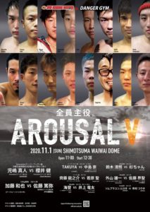 INNOVATION認定 DANGER GYM主催「AROUSAL-5」(11月1日(日)茨城・Waiwaiドームしもつま)の対戦カードが発表された。新型コロナウイルス対策として換気を考慮し、半オープンエアーの会場が採用され、メインイベントでは地元DANGER GYMの児島真人が、INNOVATIONスーパーフェザー級王座挑戦を目指し、格上のランカー・櫻井健を迎え撃つ。ほか茨城県、北関東のジム選手を中心に全8試合が繰り広げられる。