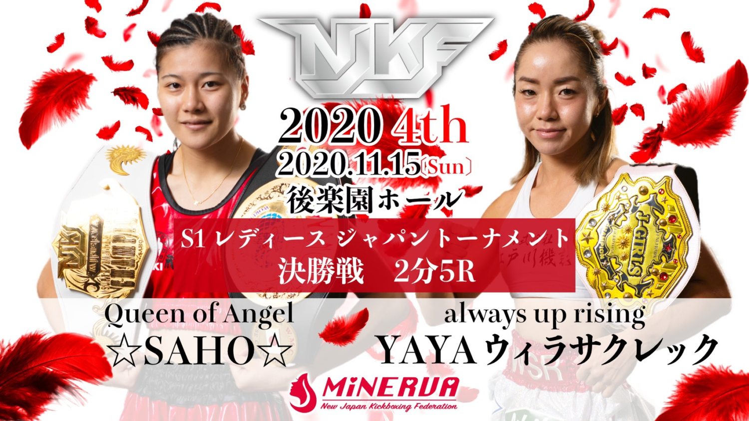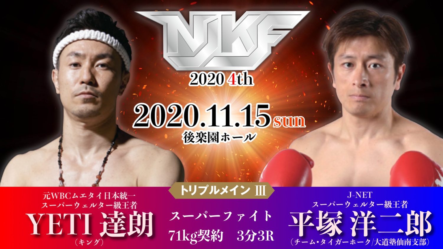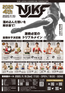 NJKF 2020 4th(11月15日(日)後楽園ホール)の全カードが発表された。トリプルメインIIIでは、元WBCムエタイ日本統一スーパーウェルター級王者・YETI達朗(キングジム)がJ-NETWORKスーパーウェルター級王者の平塚洋二郎(チーム・タイガーホーク)と対戦する。YETIは昨年2月にWBCムエタイ日本王座防衛戦でT-98に敗れて以来の試合。トリプルメインIIでは、松谷桐が返上したNJKFフライ級王座を懸け、誓(ZERO/1位)とEIJI(E.S.G/4位)が対戦する。両者とも19歳。昨年2月の対戦では誓が1R TKO勝ちしている。「S1レディース バンタム級ジャパントーナメント」は9月大会で一回戦2試合が行われ、今大会で☆SAHO☆(闘神塾/ミネルヴァ・スーパーバンタム級王者)とYAYAウィラサクレック(ウィラサクレック・フェアテックスジム幕張/J-GIRLSスーパーフライ級王者)が優勝を争う。