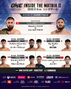 ONE Championshipはシンガポール・インドア・スタジアムで事前収録した「ONE: INSIDE THE MATRIX II」の模様を、11月6日(金)夜9時30分よりABEMA等で配信する。この放送回に日本からONE MMAフライ級4位の若松佑弥が登場する。ONEはコロナ禍を経て、7月31日からタイの首都バンコクで大会を再開。これまでシンガポールやタイ在住の澤田龍人、秋元皓貴、Little Tigerらが出場していた。10月30日から再開したONEの本拠地・シンガポールでの大会には、日本在住の選手も続々登場し、若松が放送ではその先陣を切る形となる。
