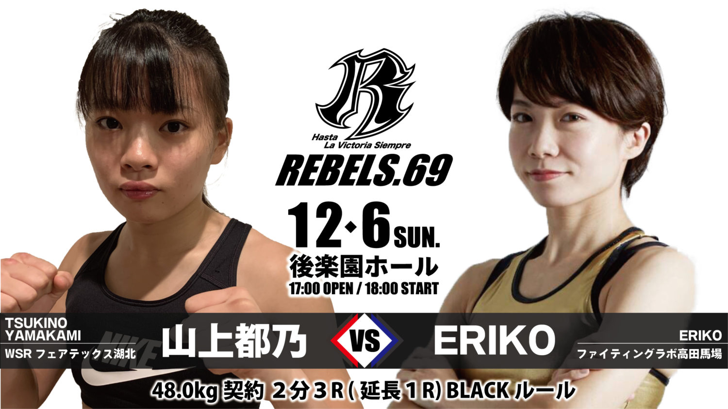 REBELS.69(12月6日(日/夜) 後楽園ホール)で山上都乃(ウィラサクレック・フェアテックス湖北)と対戦予定だった山本ユノカ(KICK BOX)が練習中の負傷によりドクターストップがかかったため欠場する。代わってERIKO(ファイティングラボ高田馬場)が山上と対戦する。山上はプロ2戦2勝の19歳。ERIKOはREBELS初参戦。4戦3勝(1KO)1敗の33歳で、山上よりも身長が10cm高い162cm。試合形式はBLACKルール女子48kg契約2分3R(延長1R)で変わらない。両選手のコメントが主催者から届いている。
