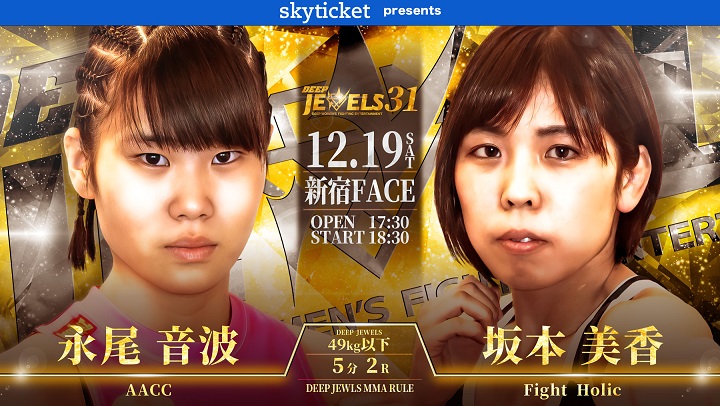 伊澤は中学時代にレスリング全国中学生選手権で優勝し、高校時代に柔道でインターハイ3位に入賞。ARAMI(フリー)とのプロデビュー戦ではグラウンドで圧倒し、大会後にDEEPの佐伯繁代表は2戦目での上位勢とのマッチメイクの可能性を示唆していた。本野も東海大柔道部出身で、伊澤との寝技勝負が見ものだ。なお、伊澤は11月29日のDEEP&パンクラス大阪大会でさくらとグラップリングマッチを行う。また、魅津希がDEEP JEWELSストロー級王座を返上し、暫定王者だった本野が正規の王者となっている。