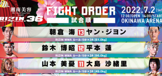 RIZIN.25(11月21日(土)大阪城ホール)の試合順が発表された。メインイベントは朝倉未来と斎藤裕によるRIZINフェザー級(66kg)初代王座決定戦で、セミファイナルには61kg契約(バンタム級相当)扇久保博正 vs. 瀧澤謙太が置かれた。また、全10試合の第6試合の後には、ホベルト・サトシ・ソウザとサトシと同門のクレベル・コイケを含む4名の柔術家による柔術デモンストレーションが行われることが発表された。4名の談話もRIZINから届いている。
