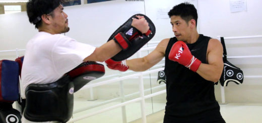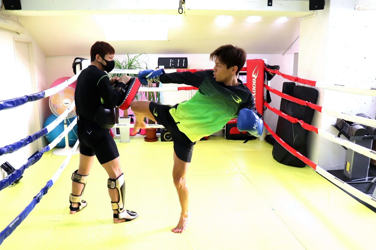 昨年からシルバーウルフを練習の拠点にしている村越。大宮司進代表の持つミットにワンツーなどのパンチ、前蹴りやローなどを打ち込むと、試合まで2週間強という段階で「いつもと変わらず。すごくいい練習ができてます」と、調整は順調に進んでいる。