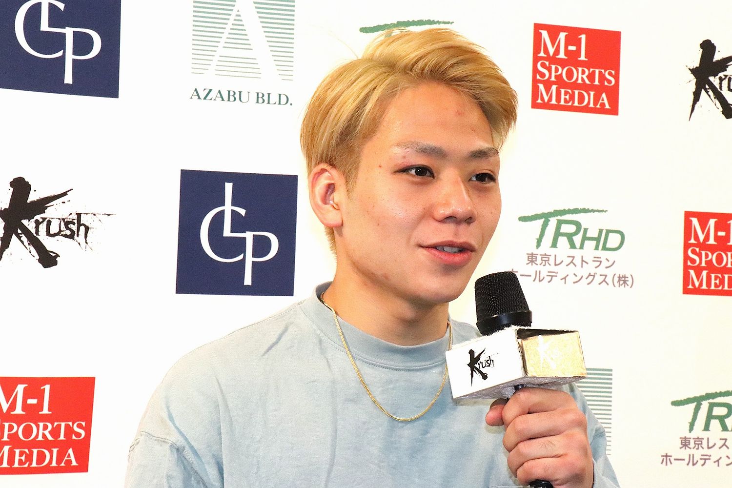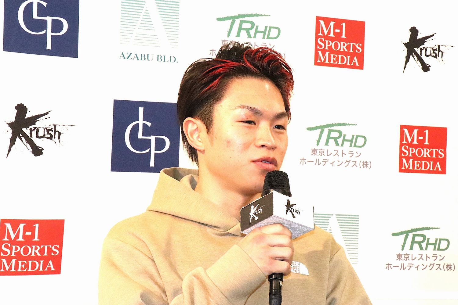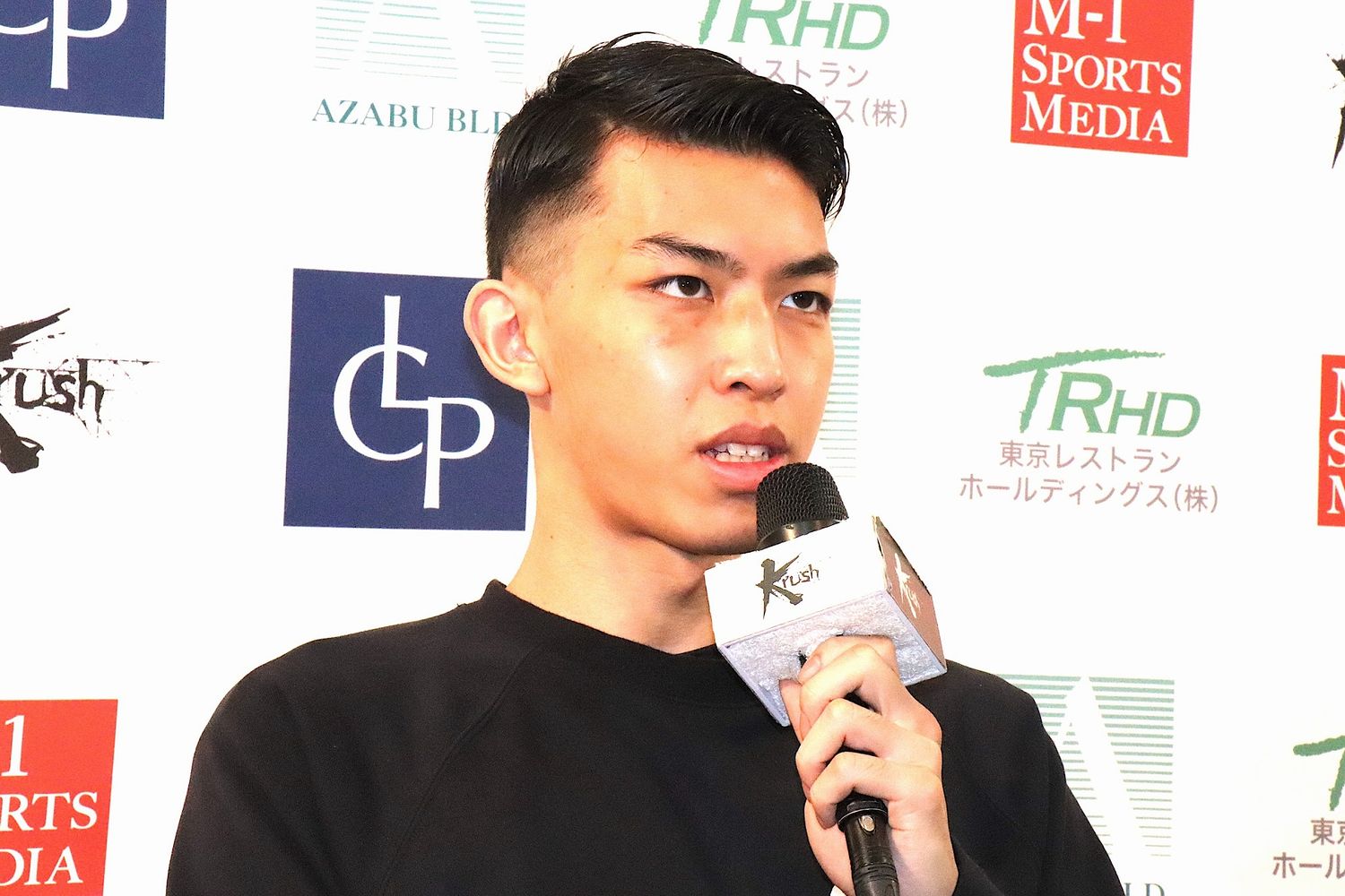(初参戦のKrushという舞台に立った感想は?)ずっと映像で見とった世界なんで。この会見も映像で見とって、やっと出れた感じなのでそこはうれしいですね。今『K’FESTA』がむっちゃ注目されとって、Krushのこの大会が薄れとったんですけど、中村プロデューサーのTwitterに『こういう時こそKrushやKrush-EXは盛り上がる』って書いてあって、それで燃えました。ありがとうございます。(自分が一番自信を持っている技は?)技はないんですけど、根性ですね。気持ちは負けへんと思います。