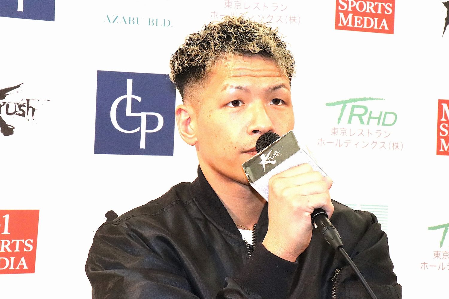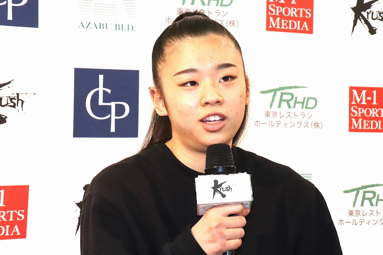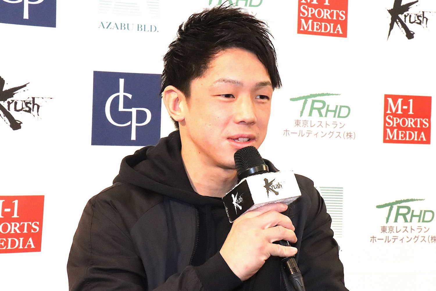 (初参戦のKrushという舞台に立った感想は?)ずっと映像で見とった世界なんで。この会見も映像で見とって、やっと出れた感じなのでそこはうれしいですね。今『K’FESTA』がむっちゃ注目されとって、Krushのこの大会が薄れとったんですけど、中村プロデューサーのTwitterに『こういう時こそKrushやKrush-EXは盛り上がる』って書いてあって、それで燃えました。ありがとうございます。(自分が一番自信を持っている技は?)技はないんですけど、根性ですね。気持ちは負けへんと思います。