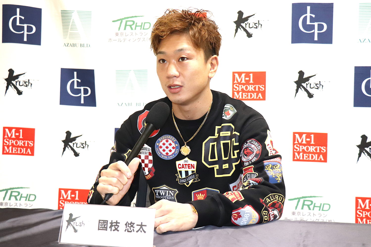 第1試合に出場した國枝悠太は、Krushフェザー級ワンマッチで林京平と対戦。試合開始から積極的に攻め込み、最後は林に左フックを打ち込んで、見事に1R1分47秒でKO勝利を飾った。
