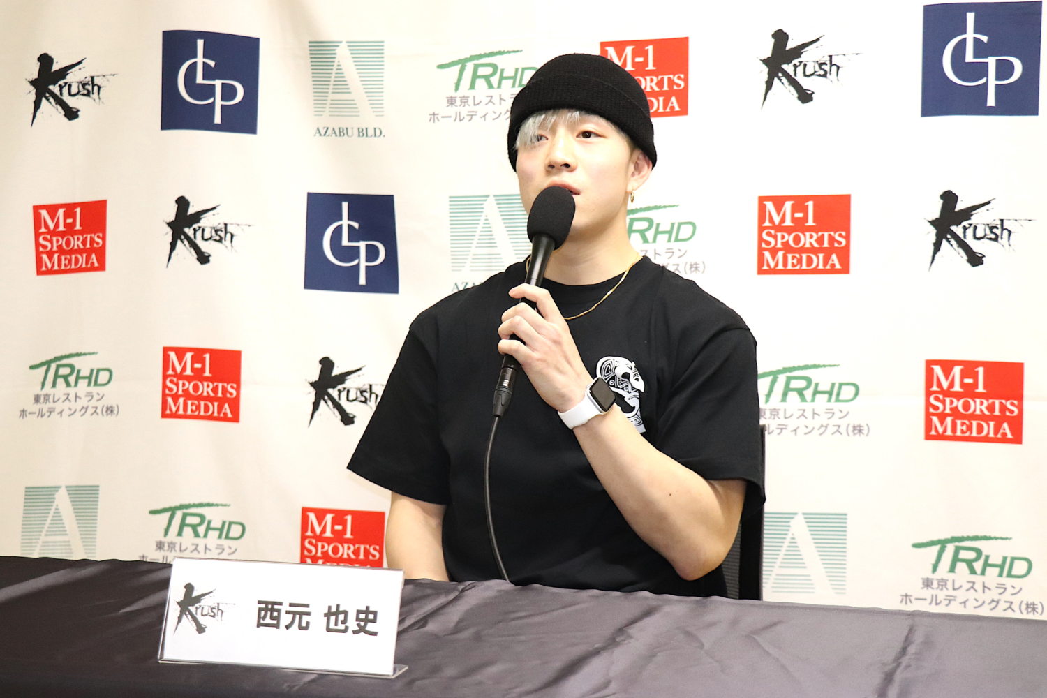 第4試合でSATORU成合とKrushスーパー・フェザー級ワンマッチを戦った西元也史は、1Rに先にダウンを奪うも、すぐさま奪い返される。しかし、2Rにもう一度ダウンを奪うと、最後はパンチを連続で叩き込んで、見事にKO勝利を飾った。
