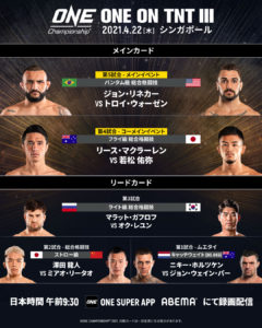 メインイベントにはMMAバンタム級1位で元UFCのランカーでもあるジョン・リネカー(ブラジル)が登場し、ONE 3勝1敗のトロイ・ウォーゼン(米国)と対戦する。