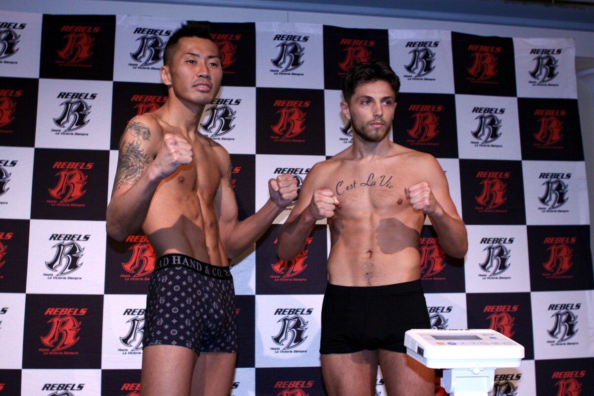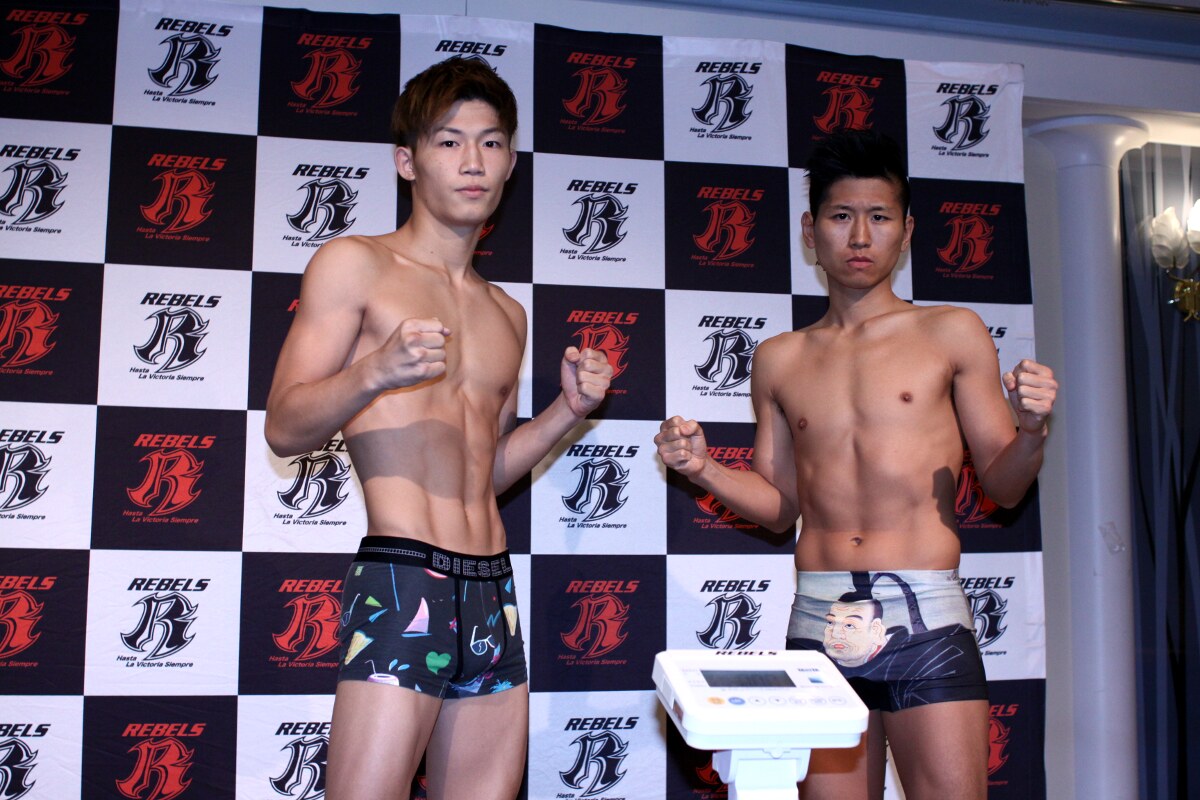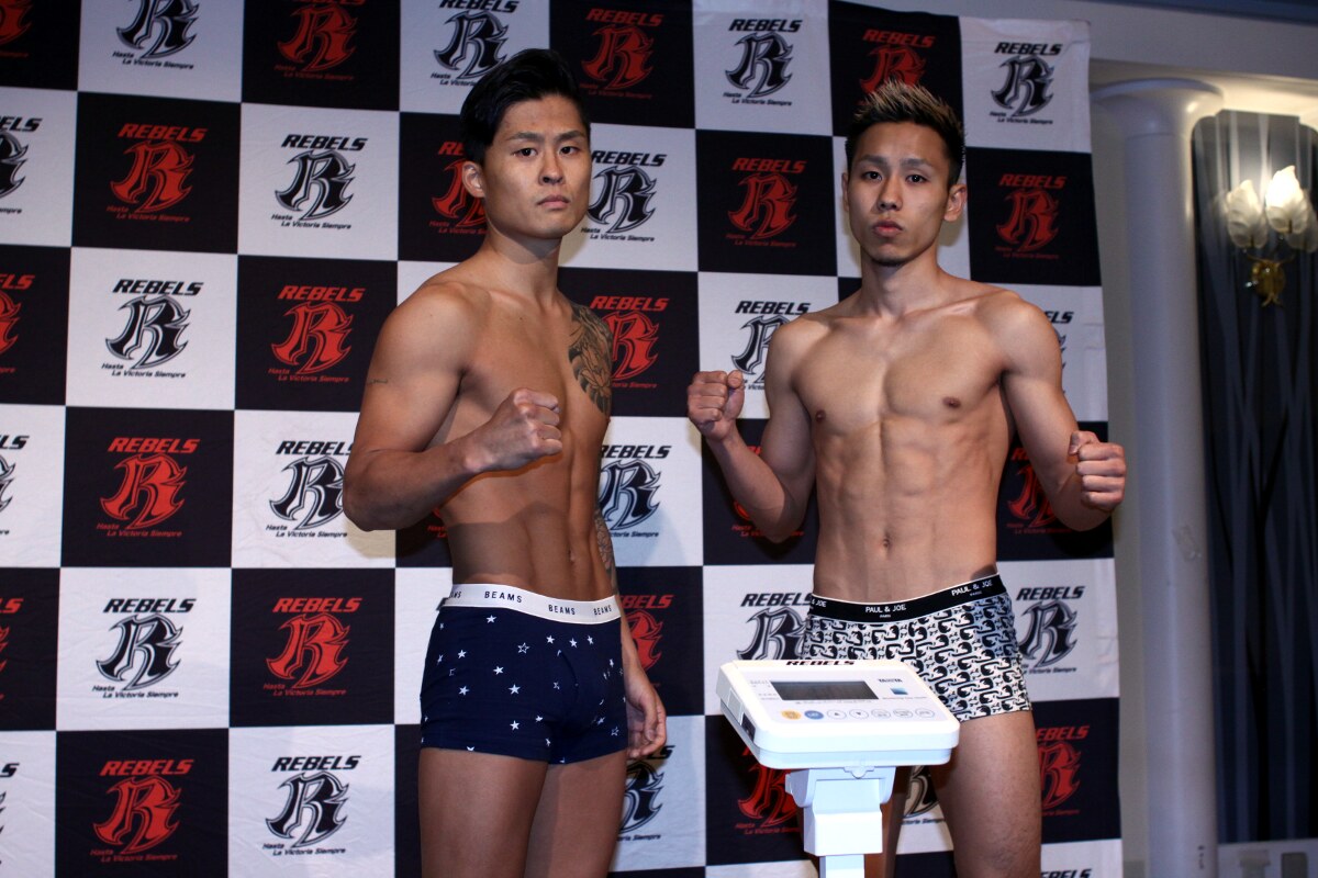 REBELS.55(4月27日(金) 後楽園ホール)の公式計量が26日午後0時30分より東京・吉祥寺で行われ、全選手が1回でクリアした。昨年はKNOCK OUTの常連選手として活躍した小笠原瑛作が、ホームリングのREBELSのメインに登場。ゲーオ、ゴンナパーの後輩にあたるダウサコン・モータッサナイ(タイ/ウィラサクレック)のWPMF世界スーパーバンタム級王座に挑む。