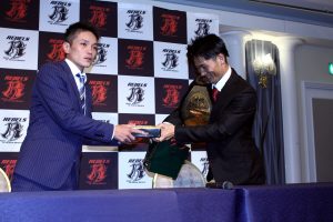 ◆KING強介(ロイヤルキングス/挑戦者、MA日本バンタム級王者、元ホーストカップ日本同級王者/55.10kg)西の地よりREBELSを荒らしに来ました。僕も守りに入らず、徹底的に潰します。(右写真:KINGはKOUMAに地元神戸土産の「おとなの神戸プリン」をプレゼントした)