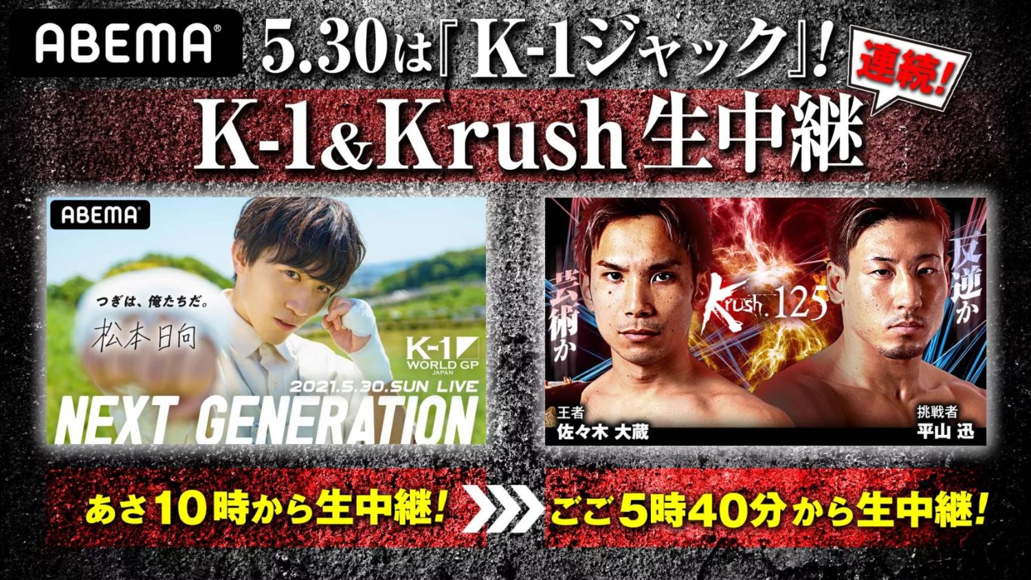 なお、同日夜からは後楽園ホールに会場を移し、Krush.125(下記)も開催される。メインイベントではKrushスーパー・ライト級王者の佐々木大蔵が平山迅を相手に防衛戦。ABEMA格闘チャンネルではそのままK-1に引き続き放送されるのでこちらも注目だ。
