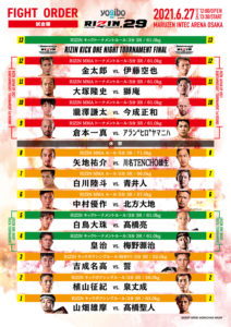 RIZIN.29(6月27日(日) 丸善インテックアリーナ大阪)の試合順が発表された。冒頭5試合はキックルールで、そのうち後ろ2試合で「RIZIN Kick One Night Tournament」一回戦が行われる。MMAワンマッチ3試合の後に休憩が入り、バンタム級日本GP一回戦4試合を実施。メインイベントではキックトーナメント決勝が行われる。