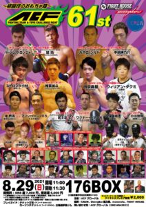 ACF 61st(8月29日(日) 大阪・176BOX)の対戦カードが発表された。今回は滋賀の谷柔術の協力で多数のブラジル人選手が出場する。MMA、グラップリング、キックボクシング、ボクシングと多様なルールの試合が行われ、プロレスも行われる。
