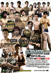 GLADIATOR 015(9月26日(日)大阪・176BOX)にGLADIATORバンタム級タイトルマッチ・竹本啓哉(ALIVE/王者)vs. 釜谷真(SWAG GYM KYOTO/挑戦者)、GLADIATORミドル級タイトルマッチ・藤井章太(LEOS MMA/王者)vs. 一慶(ENJOY”MY”FIGHT/挑戦者)他が追加され。全カードが揃った。