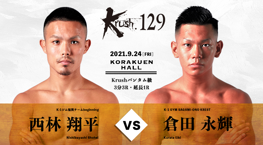 Krush.129(9月24日(金)後楽園ホール)で倉田永輝(K-1 GYM SAGAMI-ONO KREST)とバンタム級で対戦予定だった野田蒼(月心会チーム侍/K-1甲子園2020 -55kg優勝)が新型コロナウイルスの影響で欠場し、代わって西林翔平(K-1ジム福岡チームbeginning/九州プロキックボクシング(KPKB)バンタム級王者)が倉田と対戦することになった。西林は4戦1勝3敗の26歳。昨年11月と今年7月のK-1福岡大会に出場したが、大石和希と山脇飛翼に判定負けしている。