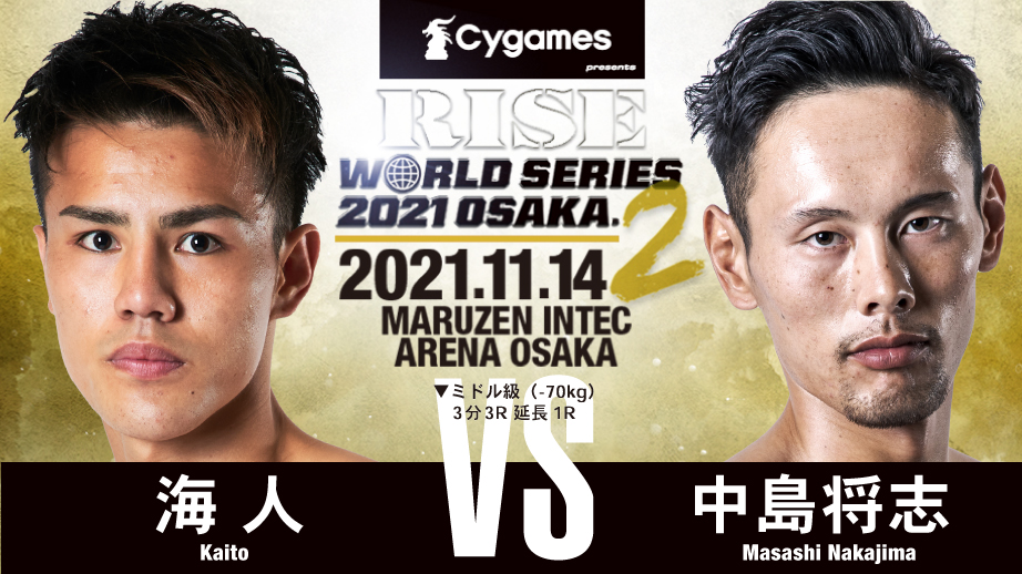 RISE WORLD SERIES 2021 OSAKA.2(11月14日(日)丸善インテックアリーナ大阪)にミドル級(70kg)海人(TEAM F.O.D/シュートボクシング日本スーパーライト級(65kg)王者、S-cup 2018 65kgトーナメント優勝、KNOCK OUT-BLACKスーパーウェルター級(70kg)王者)vs. 中島将志(新潟誠道館/RISEミドル級6位)が追加された。これで全カードが揃った。