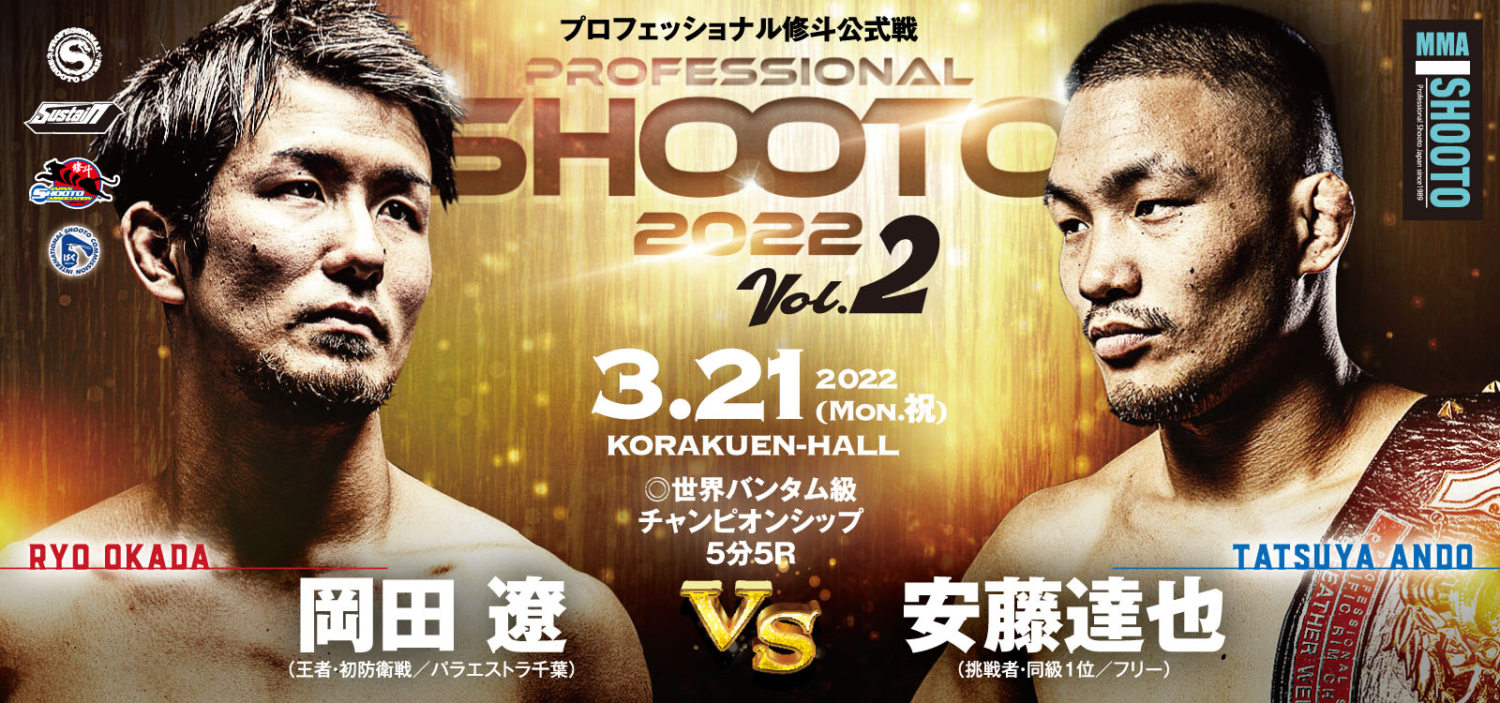 修斗 3.21 後楽園ホール:岡田遼、世界バンタム級王座2度目の防衛戦は2年半前に引き分けた安藤達也と。石井逸人×石橋佳大、後藤丈治×ダイキ・ライトイヤーも決定