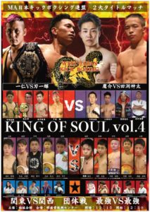 MAキック 楠誠会館主催「KING OF SOUL vol.4」(2月13日(日)大阪・堺市産業振興センター)の対戦カードが発表された。ダブルメインイベントはフェザー級とバンタム級の2階級タイトルマッチ。バンタム級の鷹介と田渕神太は、昨年7月の修斗大阪大会での全日本新空手道連盟主催CKC -54kgトーナメント一回戦で対戦し、田渕が判定勝ちしている。ジュニアの関西勢と関東勢の対抗戦の関東側では、キック49冠・曽我昂史も登場する。