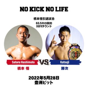 NO KICK NO LIFE(5月28日(土) 東京・豊洲PIT)で、橋本悟(橋本道場/INNOVATIONスーパーライト級王者)が引退試合を行うことになった。勝次(藤本ジム/WKBA世界スーパーライト級王者)と3分5Rで対戦する。
