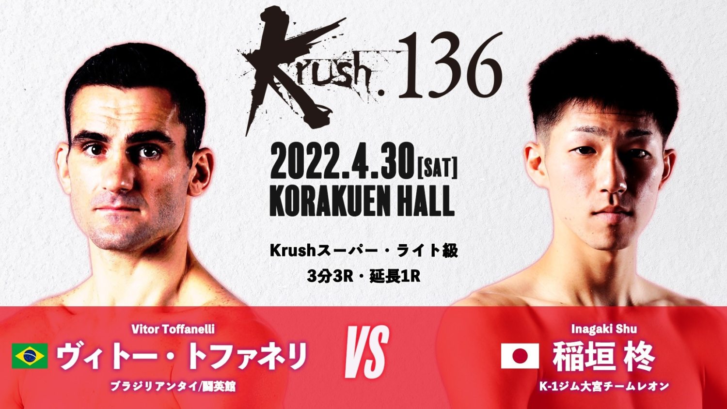 Krush.136(4月30日(土)後楽園ホール)に出場予定だった近藤拳成(大成会館/キックボクシングジム3K)が、右舟状骨骨折で全治2ヶ月と診断され欠場する。近藤は21年2月以来1年2ヵ月ぶりの試合の予定だった。近藤に代わってヴィトー・トファネリ(ブラジル/ブラジリアンタイ/闘英館)が出場し、稲垣柊(K-1ジム大宮チームレオン)とスーパー・ライト級で対戦する。