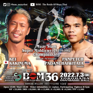 その他、石井一成を筆頭に活躍するウォーワンチャイプロモーションからシンイチ・ウォーワンチャイ、タクト・ウォー・ワンチャイ、押川香菜の3選手が参戦。シンイチは優心(京都野口ジム)とWMC日本フライ級(50.80kg)次期挑戦者決定戦で対戦。タクトは渋江健司(Y’ZD GYM)と、BOM女子部門期待の押川は岩﨑美穂(YSSジム)とそれぞれ対戦する。また、4月のBOMでWMC日本女子バンタム級(53.52kg)次期挑戦者決定戦に勝利したNANA☆SE(MSJキックボクシングジム)が北川柚(京都野口ジム)と対戦する。