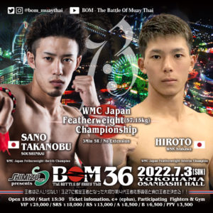 また、WMC日本フェザー級(57.15.kg)タイトルマッチで王者・佐野貴信(創心会)が大翔(WSR荒川)を挑戦者に迎えて防衛戦を行う。佐野はバランスのいい攻撃を持ち味として各団体のランカー入り。BOMでは2019年4月に川原龍弥とのWMC日本フェザー級王座決定戦を制しベルトを巻いた。同年12月には松本龍斗の挑戦も退け初防衛に成功している。
