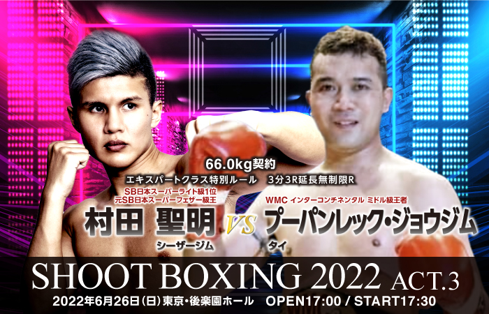 出場が決定していたSB日本スーパーライト級1位・村田聖明(シーザージム)の相手はプーパンレック・ジョウジム(タイ)に決定。プーパンレックは来日して以降、国内の様々な団体に上がり、2019年6月には強烈な右ミドルで圧倒し、WMCインターコンチネンタルミドル級タイトルを獲得した。