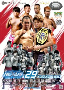 Fighting NEXUS vol.29(11月7日(月)後楽園ホール)にライト級・ジェイク・ウィルキンス(米国/フリー)vs. キム・ハンオル(韓国/コリアン・トップチーム/TFC)、フェザー級・島村裕(宇留野道場)vs. 栁川唯人(K-PLACE)、ストロー級・木内“SKINNY ZOMBIE”崇雅(和術慧舟會GODS/修斗世界7位)vs. 楠美貴嗣(T-Pleasure)が追加され、全試合が揃った。試合順も発表されている。なお、開場時刻が17:30、本戦開始時刻が18:00と、予定より30分早くなっている。