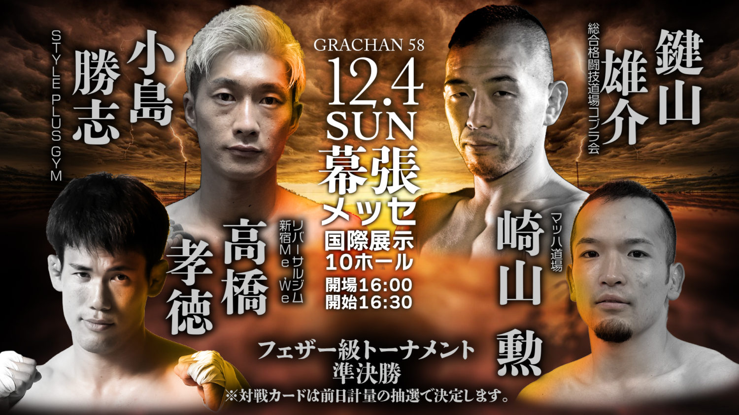 GRACHAN 58(12月4日(日)千葉・幕張メッセ)の対戦カードが発表された。8.7 大阪、8.28 札幌、9.4 幕張の3大会で一回戦の行われた、無差別級&フェザー級王座決定トーナメントの準決勝各2試合を行う。組み合わせは未定で、前日計量時の抽選会で決定する。