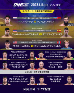 ONEの2023年の開幕戦「ONE Fight Night 6: Superbon vs. Allazov」が1月14日(土)タイ・バンコク・インパクトアリーナにて開催される。大会の模様はABEMA格闘チャンネルにて同日朝10時より無料生中継される。