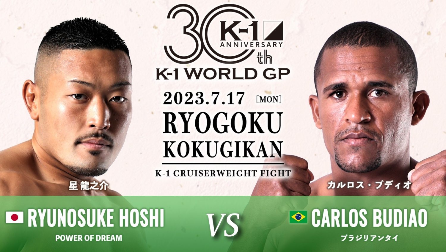 極真空手の新鋭・星龍之介はカルロス・ブディオと対戦。星は空手仕込みの強烈な打撃とPOWER OF DREAM仕込みの破壊力が武器。過去には第35回全日本ウェイト制空手道選手権大会・第3位、第12回オープントーナメント全世界空手道選手権大会・第6位の実績を残した。昨年4月からK-1 GROUPに足を踏み入れ、4戦4勝(4KO)でKO率100%だ。