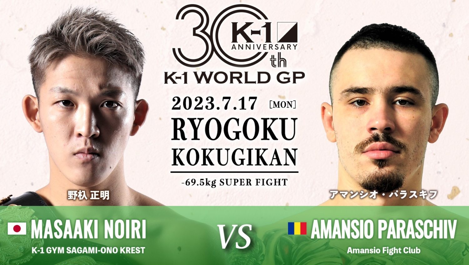 K-1ウェルター級王者・野杁正明が、-69.5kg契約のスーパーファイトで、ルーマニアのアマンシオ・パラスキフと対戦する。今年3月「K’FESTA.6」で世界的な実績の持ち主であるジャバル・アスケロフを1RKOで沈めた野杁。昨年6月の「THE MATCH 2022」で海人に敗れてから、拳の負傷もあり約10カ月の長期欠場をしていたが、見事なKO劇で復活をアピールした。今回もアスケロフに続き、ルーマニアの格闘技イベント「SUPERKOMBAT」を主戦場にするアマンシオという海外の強豪が、その対戦相手に選ばれた。