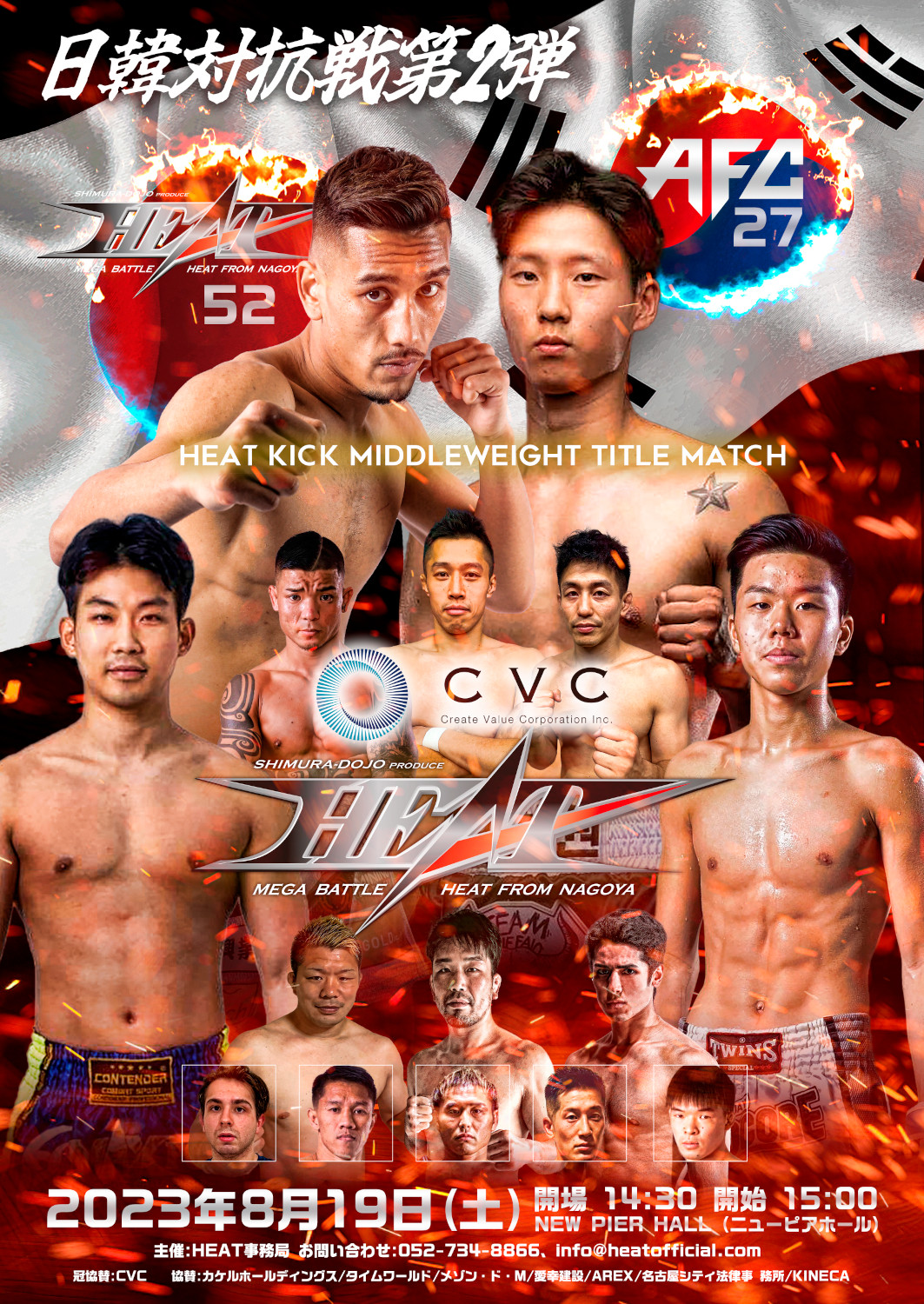 HEAT 52 × AFC 27(8月19日(土)東京・ニューピアホール)の対戦カードが発表された。4月に韓国で行われたHEATとAFC (Angel’s Fighting Championship) の対抗戦の第2弾で、今回は韓国勢を迎え撃つ構図での対抗戦が8試合組まれた。HEATの日本大会は昨年5月のHEAT 50以来となる。