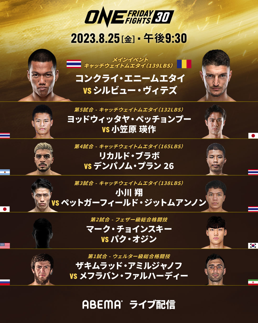 ONE FRIDAY FIGHTS 30(8月25日(金)タイ・バンコク・ルンピニースタジアム)に日本から小川翔、リカルド・ブラボ、小笠原瑛作の3選手が参戦する。このうち小川、瑛作のインタビューがONE日本支部から届いた。3選手ともムエタイルールで戦う。大会の模様はABEMA格闘チャンネルにて21時30分から放送され、第3試合に小川、第4試合にブラボ、第5試合に瑛作が登場する。